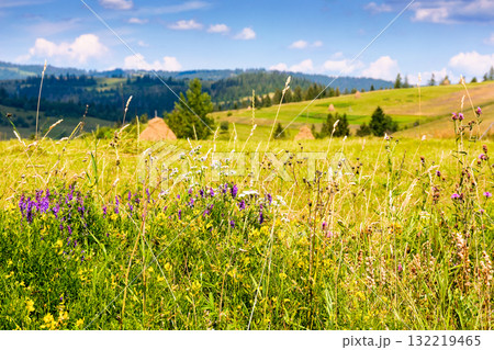 nature background with flowers on the mountain meadow. blooming carpathian landscape with herbs among green grass on a sunny summer day. wonderful rural scene with field on rolling hills and blue sky