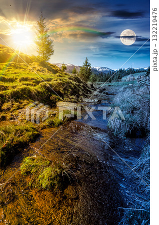 autumn equinox landscape in mountains. beautiful view of countryside. day and night time change concept. alps in the background. cloudy sky. picturesque rural scenery with village with sun and moon