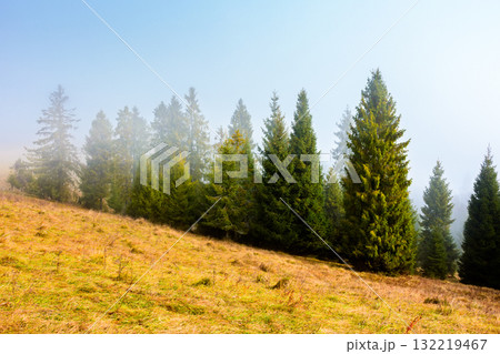 fir forest in fog. misty landscape with coniferous trees. mysterious morning background in mountains. cold autumn weather forecast in carpathians.