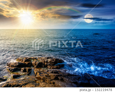 sea coast with rocks and boulders. day and night time change concept. calm summer vacation background at the seashore. wonderful scene for relax and leisure at the seaside with sun and moon