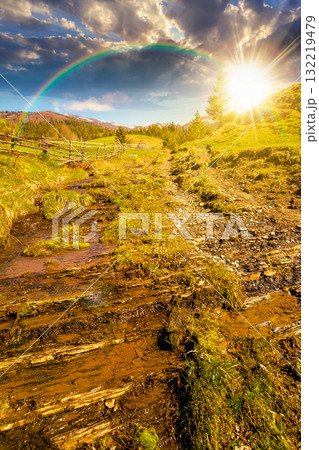 rural scene of mountain landscape in spring at sunset. green countryside with forested hills in evening light. beautiful valley sustainable development under rainbow