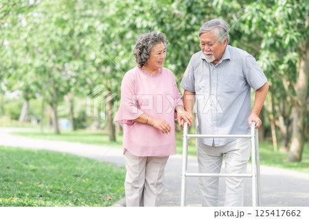 Happy senior couple walking in the park