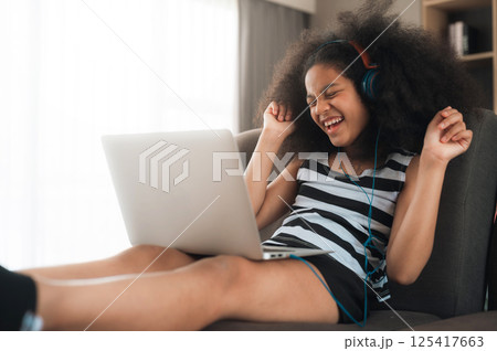 Happy girl using laptop at home