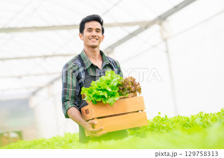 Happy asian man in hydroponics vegetables farm