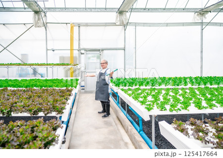 senior Asian man n greenhouse hydroponic farm