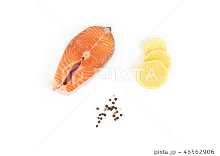 fresh steak of a salmon with lemon and pepper, isolated on white background.