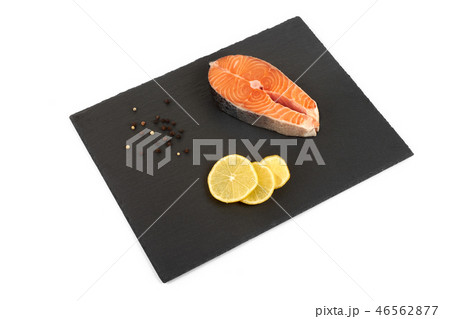 fresh salmon steak on a slate plate , isolated on a white background.