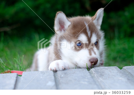 Puppy dog husky is waiting on the street, with