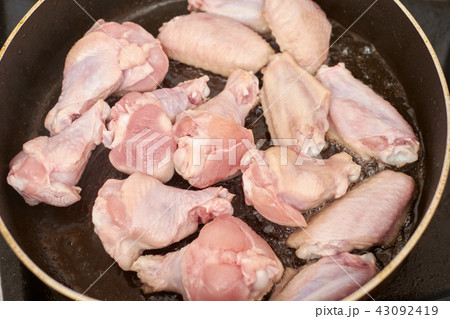 Chicken wings fried in pan with hot oil, homemade food