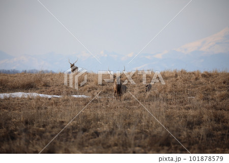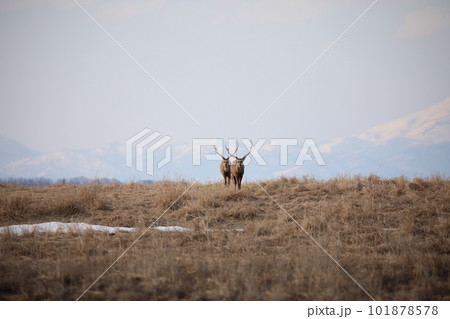 同時に後ろを振り向く釧路湿原の二匹のエゾジカ