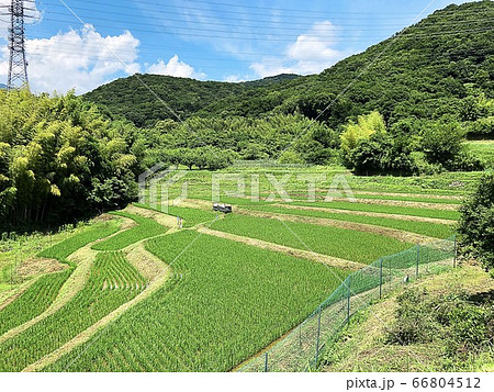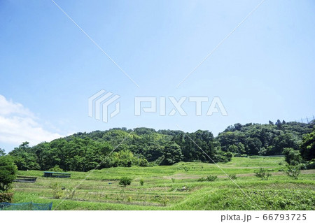 新緑の棚田と山並みの風景