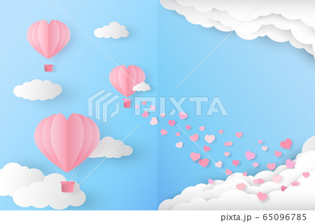 Pink heart ballons with mini hearts on blue sky background,paper cut style for valentine's,wedding and invitation card.