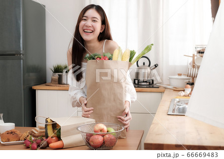 Cute asian woman holding shopping paper bag for breakfast in the kitchen,look at the camera and smile brightly.