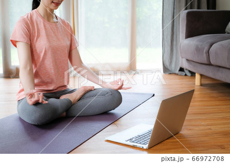 Sporty woman watching meditation tutorial on laptop and doing yoga at home.