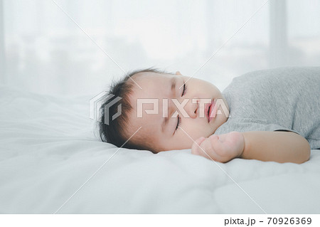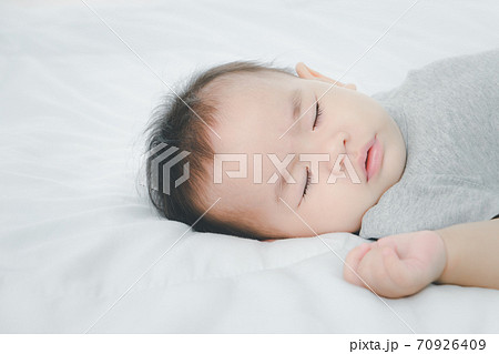 Cute 7 months asian baby girl is sleeping on bed in the morning.Newborn little child sleep have nice dream.