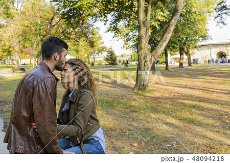 Young couple showing love in the city park