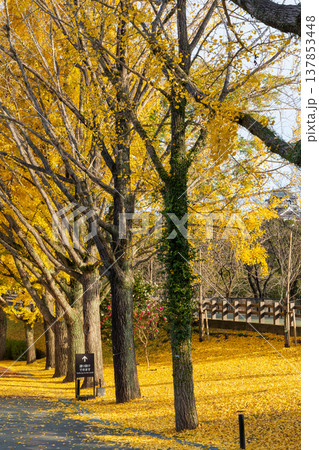 秋の熊本県熊本市 日本100名城 熊本城 イチョウの落ち葉