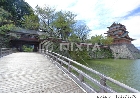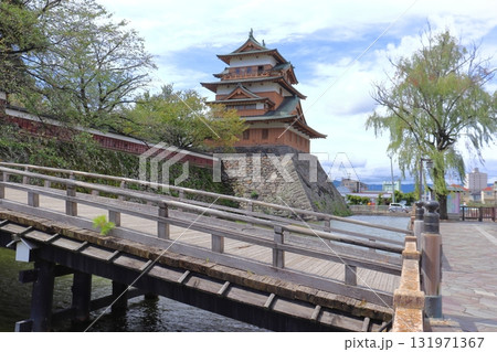 諏訪高島城の冠木門の橋と天守(長野県諏訪市)