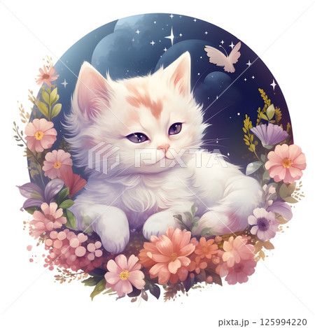 Illustration of a cute cat delicate pastel flowers starry night sky.