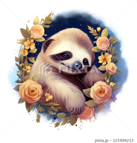 Watercolor Illustration of a sleeping sloth delicate pastel flowers starry night sky.