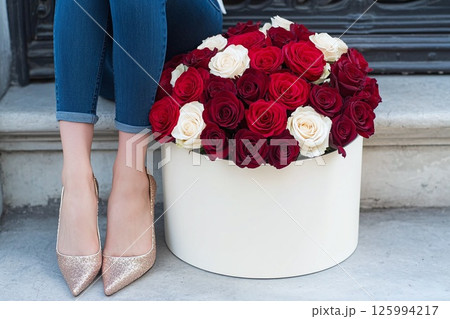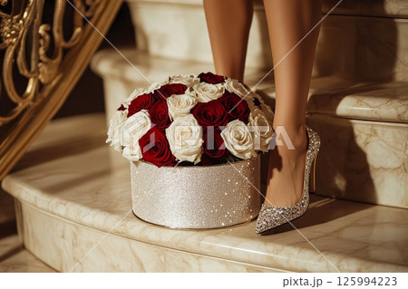 A luxurious bouquet of red and white roses is in a decorative gift box, woman legs in sparkly shoes.