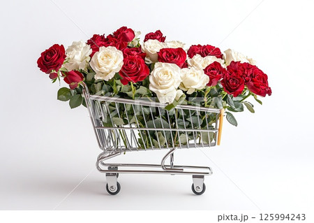 Shopping cart with red and white roses on white background