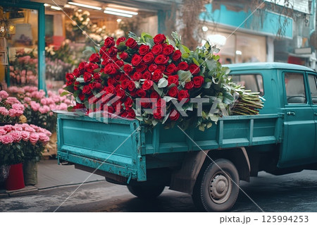 Vintage truck with vibrant red roses near flower market