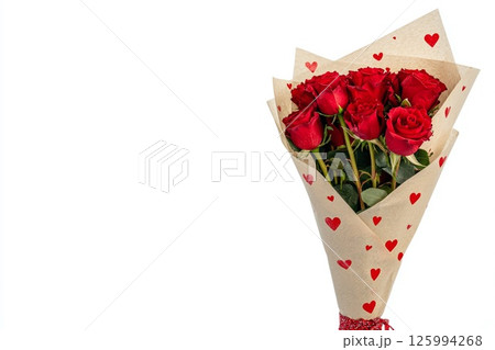 Elegant bouquet of red roses wrapped in craft paper with red hearts on white background. Valentines Day banner, weddings, anniversaries, or floral gift ideas. Marketing, blog articles,