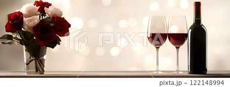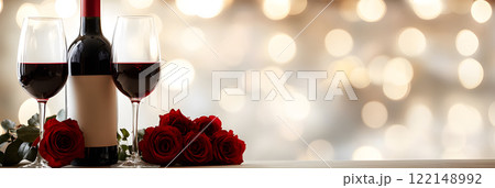Valentines banner, bokeh background, bottle of red wine, wine glass, bouquet of red roses, empty space. Template for Valentine's Day menu advertisements, anniversaries, celebrations, mock up.