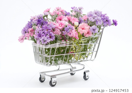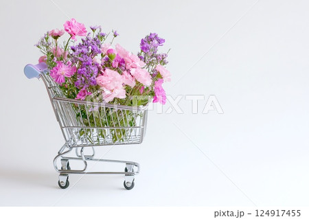 Shopping cart with summer pink flowers on white background, an empty space for text. Festive banner, template for advertisements of online shopping, flower delivery, weddings, floral gifts