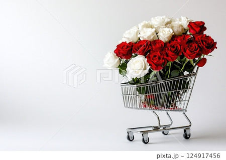 Shopping cart with red and white roses on white background and an empty space for text. Valentine's Day banner, template for advertisements of online shopping, flower delivery, weddings, floral gifts