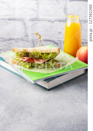 Snack for school with sandwich, fresh Apple and orange juice. Colorful school supplies, Copy space,