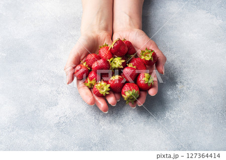 handful Juicy ripe strawberries in the hands on a concrete background. Sweet healthy dessert, vitamin harvest. copy space.