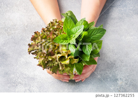 Fresh basil leaves, mint and lettuce. A bouquet of fragrant herbs and spices and women hands.