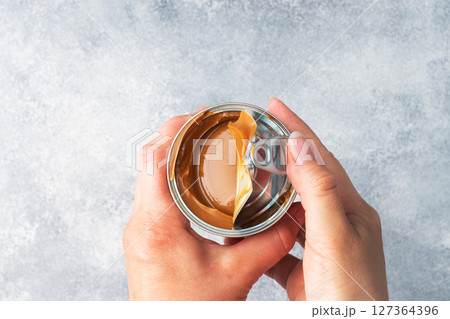 Boiled condensed milk in a tin can. Sweet pasta spread for Breakfast and dessert. Copy space.