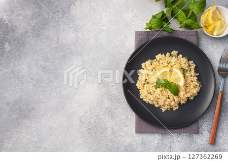 Boiled bulgur with fresh lemon and mint on a plate. A traditional oriental dish called Tabouleh. Gray concrete background top view, copy space