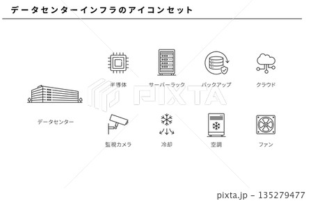 データセンターインフラを構成する基本要素のアイコンセット|サーバーラック・クラウド・冷却・空調・監視