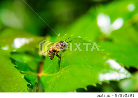 Bee on a green leaf.