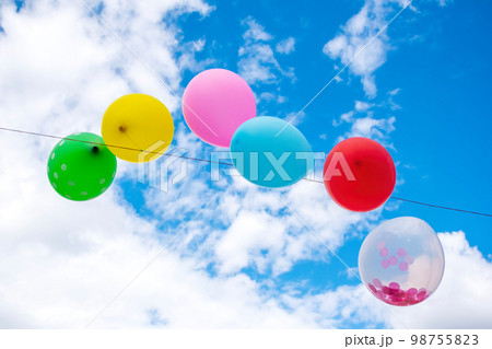 Party balloons in front of a cloudy sky.