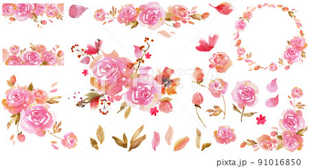 Watercolor hand painted floral set. Pink gentle roses elements. High quality illustration