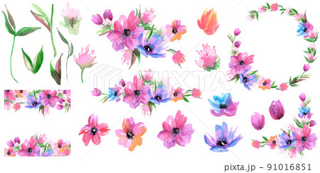 Watercolor hand painted floral set. Pink and blue flowers. High quality illustration