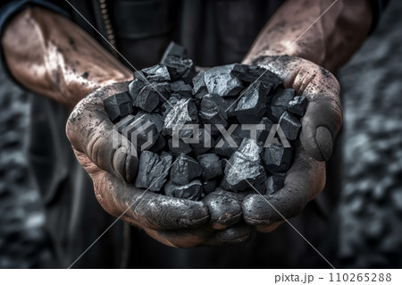 Coal mining in mine. Coal in hands of miner worker. Metallurgical coal for steel.
