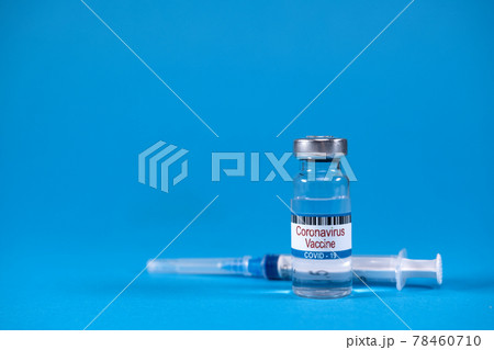 Coronavirus vaccine in bottle on blue background with space for text. Victory over Corona virus SARS-CoV-2 epidemic, scientists have found vaccine against coronavirus SARS-COV2.
