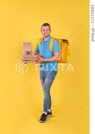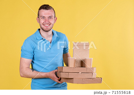 Unshaven young caucasian guy smiling and holding boxes of ready-made food, pizza, coffee, dressed in blue t-shirt and denim pants on yellow background. Concept food grocery delivery for home