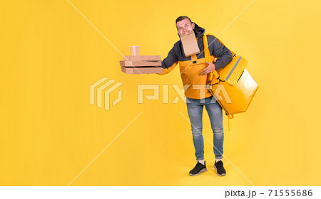 Delivery guy in blue uniform is walking talking on phone holding an order with food from restaurant and talking to customer behind his back he has delivery guy's refrigerator bag on yellow background