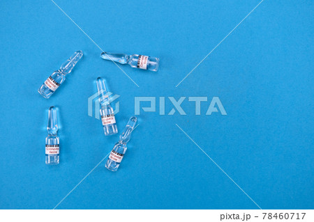 Glass ampoules with ready-made covid19 vaccine lie on blue, blank with space for text view from top. Concept of vaccinating people and fighting SARS-nCov pandemic. Invention vaccine from 2019-nCoV.