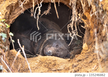 Eurasian brown bear waking up from hibernation