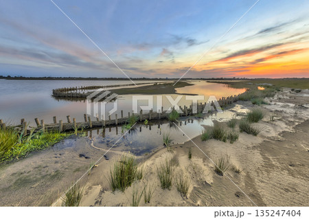 Wetland landscape with orange colored sunset