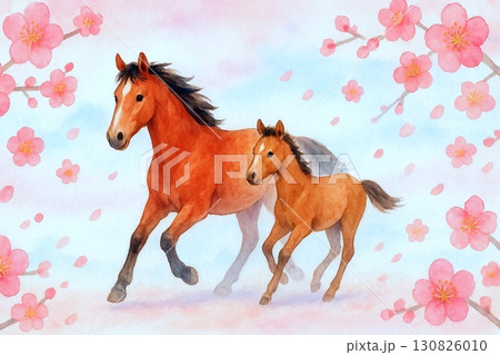 桜舞う駆ける馬の親子(水彩イラスト)