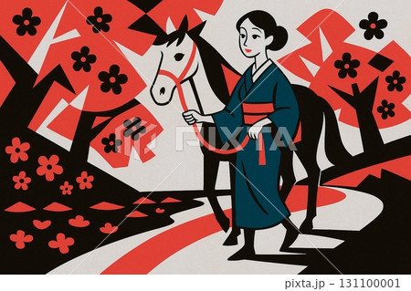 レトロアート風 馬と歩く着物姿の女性